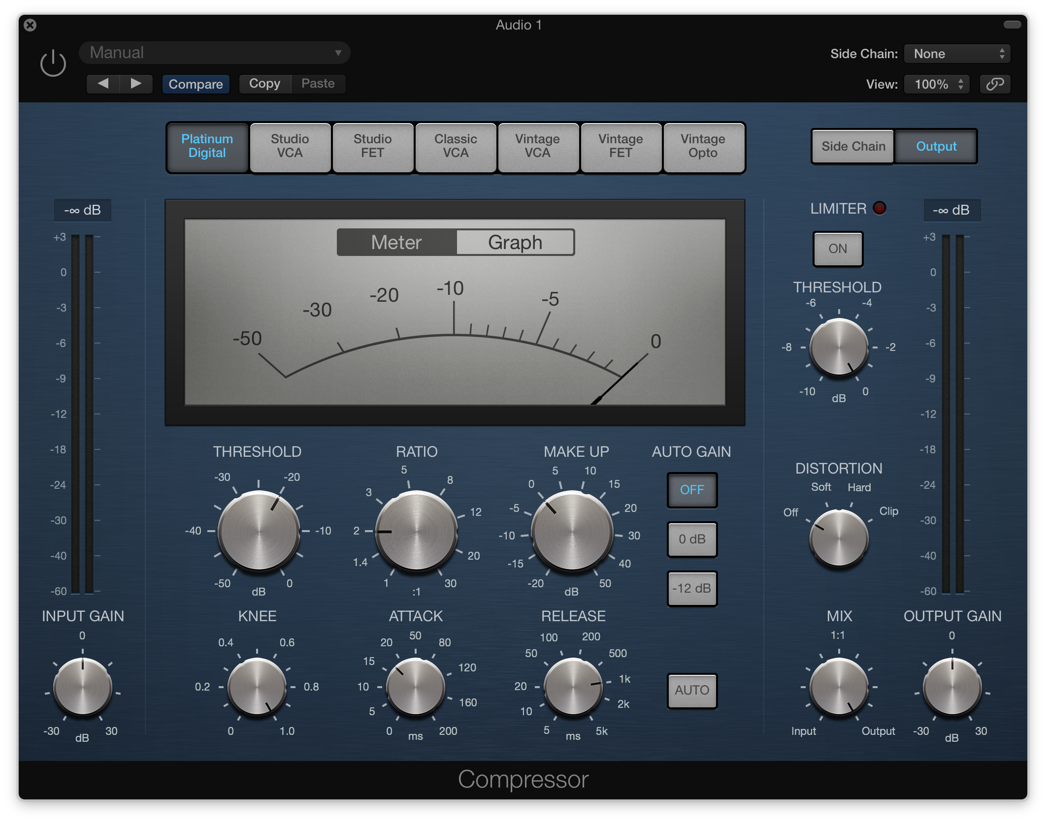 Vintage FET is the emulation of the UREI 1176 Silver Face. Which had different components compared to the _Universal Audio 1176 _but the same controls. As above, we can’t access the “all-button” mode in Logic’s version.