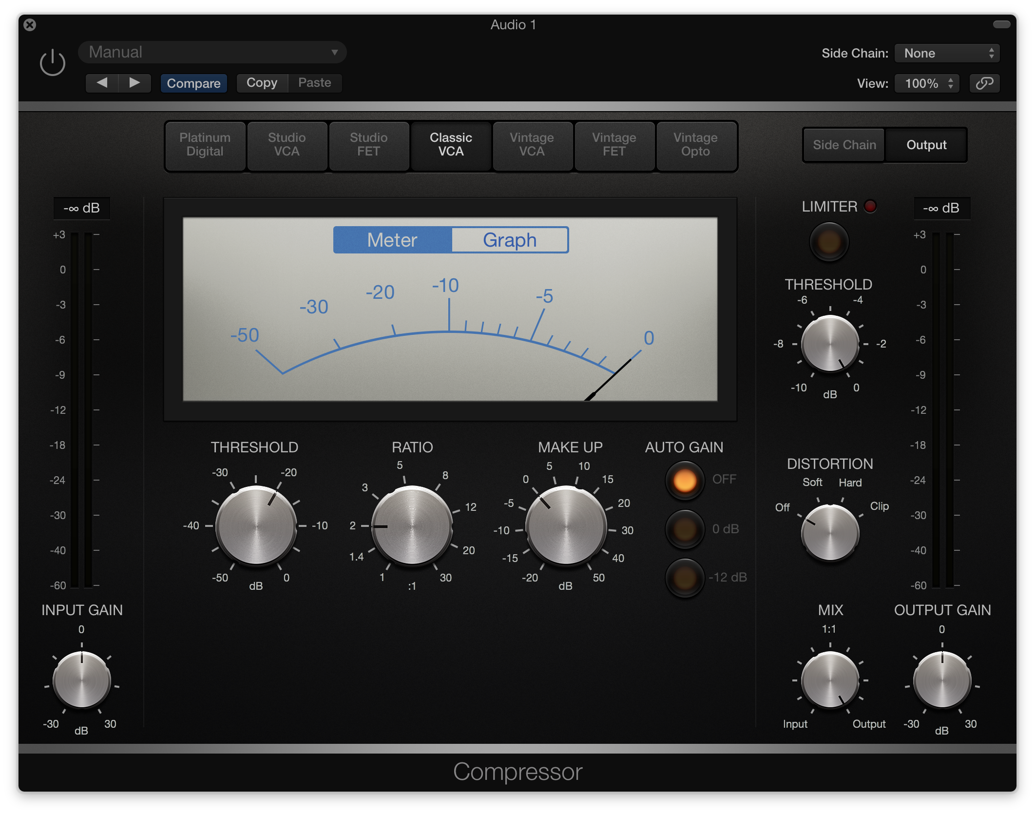 This circuit type has been introduced with this latest update so it is completely new. The Studio VCA is an emulation of the Focusrite Red 3 Dual Compressor and Limiter (you can find the user manual here). As the name implies, the original hardware version can be used as a stereo or dual mono compressor and has its own limiter module which can ben enabled separately. The controls are: ratio (1.5:1, 2:1, 3:1, 5:1, 7:1 or 10:1), threshold (the original range is between -24dB to +12dB), attack (fast to slow), release (from 0.1 to 4 seconds) and make-up gain. Logic Pro X allow us to user different values for all this controls but I strongly suggest you to stick with the original values: anything is easier to use when you have less choices.