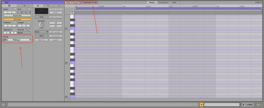 Come in Live 11 possiamo cliccare sul pulsante Scale per eliminare dalla visualizzazione le note che non fanno parte della scala/tonalità selezionata nella clip.