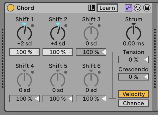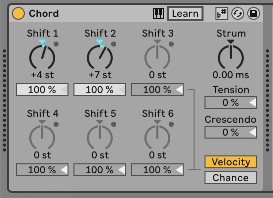 Ecco che, ad esempio, se in Chord voglio creare un accordo maggiore in Live 11 avrei dovuto impostare +4st (3a maggiore) e +7st (5a giusta) mentre in Live 12 avendo selezionato una scala maggiore, sarà sufficiente settare gli shift a +2sd e +4sd.