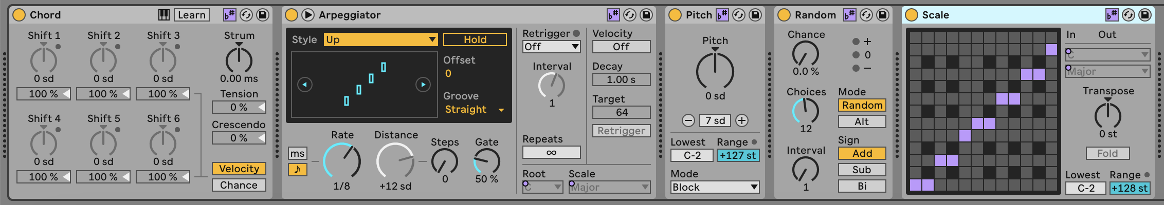 Come potete vedere nell’immagine qui sopra, gli effetti che agiscono sulle note in termini di pitch quindi Chord, Arpeggiator, Pitch, Random e Scale, sono stati tutti aggiornati e presentano la possibilità di attivare la funzione scale awareness su ciascuno di essi indipendentemente.