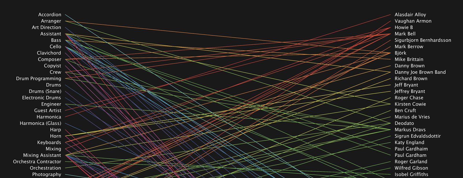 I would like to virtually thank Jer Thorp aka blprnt for being an inspiration with his talks and works. I became obsessed with data because of him. Daniel Shiffman and his great series of video tutorials on Processing. Matthew Epler for his "Intro to Processing for Data Viz" tutorials. Evelina for being so patient, Cristina, Matteo and Veronica for their support.